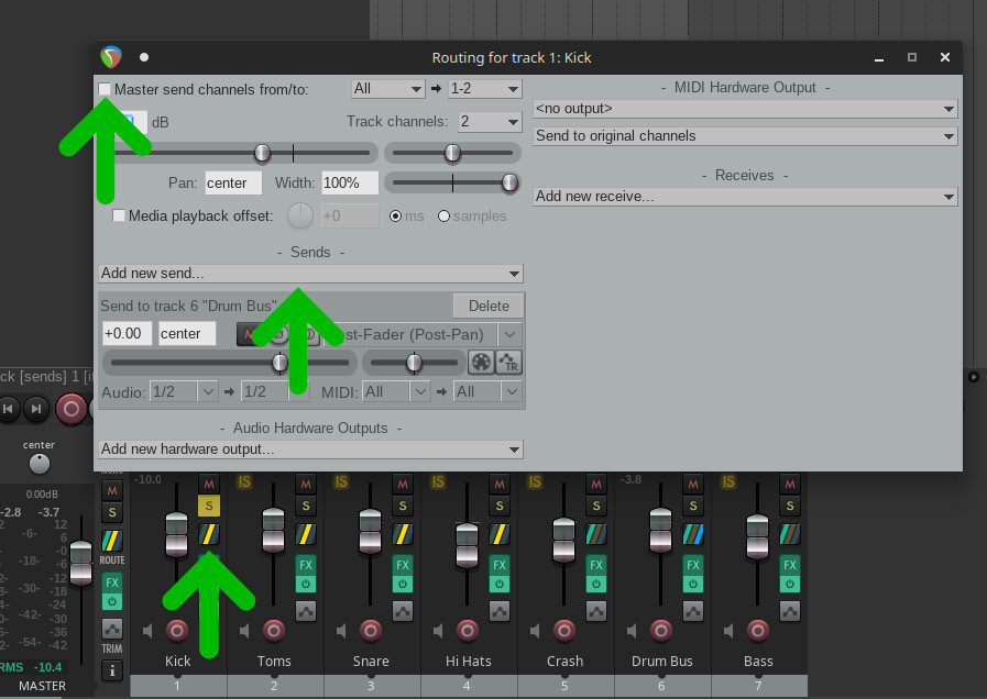 So now you can configure any EQ, compression and effects per drumkit section, and the overall drum kit on the bus track. This is a ball park gauide and will need tailering as per environemnt, use your ears!