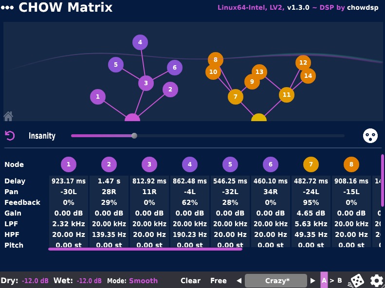 CHOW Matrix is a uniquely creative freeware delay, built around a branching network of delay nodes—each with independent controls for timing, feedback, panning, filtering, distortion, diffusion and even pitch-shifting. This design gives it an enormous range: you can craft anything from straightforward multi-tap delays to intricate, evolving patterns or huge, reverb-like textures full of motion and unpredictability. Because it’s open-source and available in common plugin formats (VST/VST3, AU, and standalone), it’s accessible to nearly anyone looking for unconventional delay effects. However, the same depth that makes it exciting can also make it intimidating; the interface and sheer number of parameters may feel like overkill if you only need a quick, standard delay. Overall, CHOW Matrix shines as a tool for experimentation and sound design, offering creative potential well beyond what most free delays attempt.