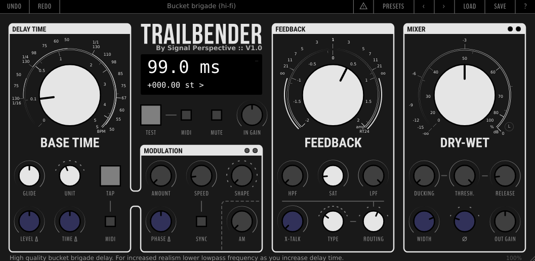 Trailbender stands out as a highly experimental delay unit that blurs the line between echo processor and full-on sound-design instrument. Built around a delay line enhanced with modulation, saturation, filtering, and flexible routing options, it lets you move far beyond standard repeats. You can craft swirling pitch shifts, warped textures, evolving feedback tones, or even synth-like drones depending on how you push its parameters. With a clean, color-coded interface and helpful tooltips, Trailbender provides both depth and usability—making it a powerful choice for anyone exploring creative or unconventional delay effects.