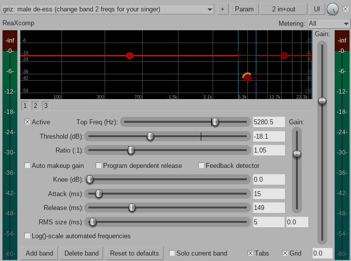 Reaper’s ReaXComp works surprisingly well for this, especially when you zero in on the usual sibilant range (somewhere between 5 kHz and 9 kHz). ToneBoosters’ Compressor 4 includes its own deessing mode, and AirWindows’ minimalist DeEss plugin is a nice lightweight alternative. Whichever tool you choose, the goal is simple: tame those harsh consonants without dulling the overall brightness of the vocal.
