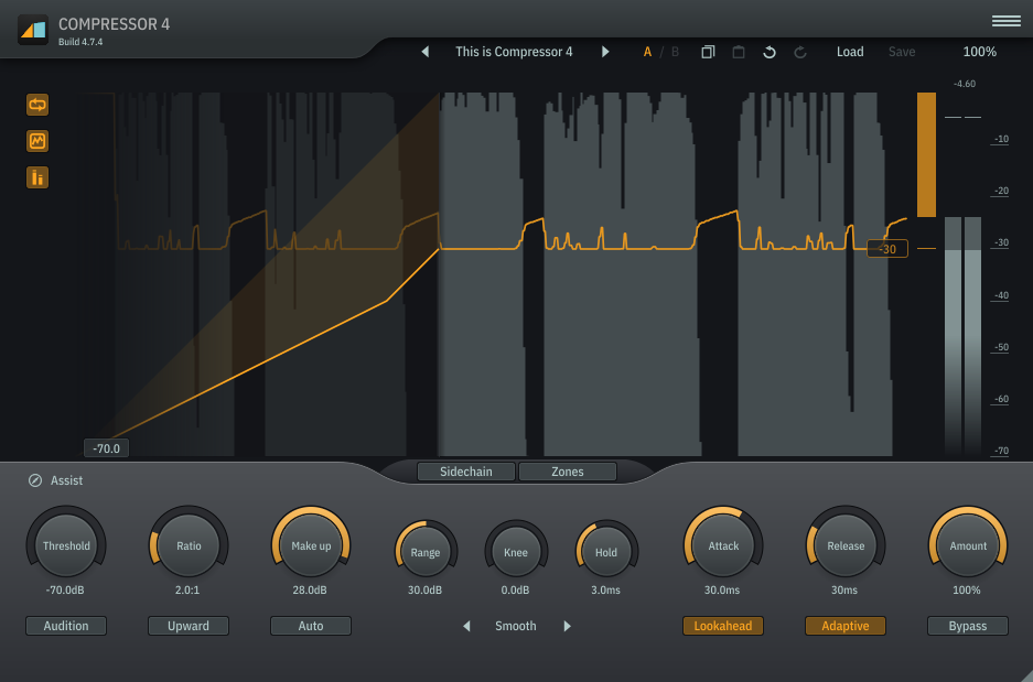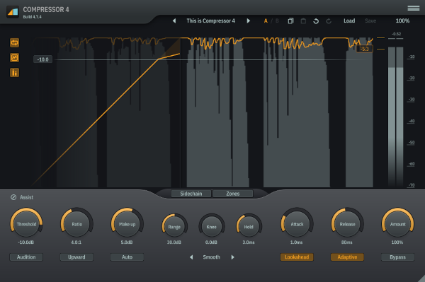A fast 1ms attack catches sharper transients, while an 80ms release lets the compression breathe naturally. The 4:1 ratio provides firm but musical control. Slowly pull the threshold down until you see around –9 dB of gain reduction on the louder phrases—this ensures the vocal stays present without sounding crushed. Then use the make-up gain to bring the output back up to around –1 dB, restoring perceived loudness.