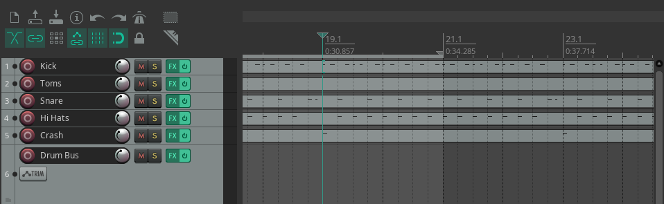 So now you can configure any EQ, compression and effects per drumkit section, and the overall drum kit on the bus track. This is a ball park gauide and will need tailering as per environemnt, use your ears!